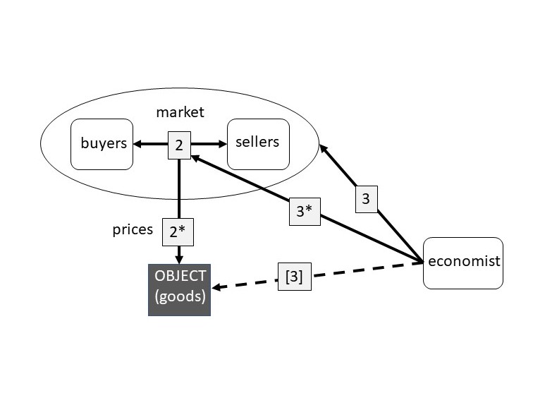 Our book develops a simple epistemological triad, the ‘three views’: first person, second person and third person. The first person view corresponds to what economists refer to as ‘subjective value’. The second person view is established on the marketplace via interactions among economic agents, and the third person view is the view of an external observer. Let us consider the notion of ‘scarcity’, which is often seen as the core concern of economics. Mainstream economics has a complicated epistemological relationship with ‘scarcity’. As shown in the figure below, taken from our book (which leaves the first person view only implicit, which is the subjective value of a good). Economists do not think that their science offers a direct access to the notion of ‘scarcity’ ([3]): Scarcity is not a property that can be measured independently from the market. That means, first, they approach the market as an object (3) in the sense of reifying it as a kind of distributed computational system in which the interaction between buyers and sellers establishes a price. The price is a second-person view (2) since it is contingent on these interactions. Yet, economists assume that this price is the only measure of scarcity, which means that the price is ‘objectified’ (2*) by the interactions and treated as such by the economist (3*).