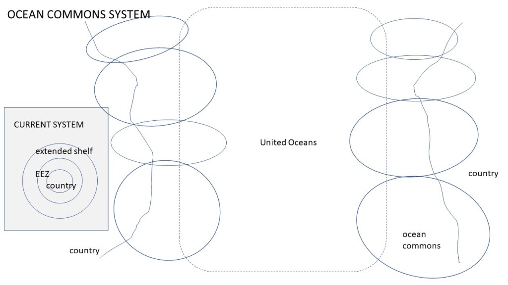 Commons that would include both humans and non-humans as shared owners would drastically change the legal basis of claims on the oceans. Instead of marking extended continental shelf according to sovereign claims, the areas contingent to human settlements would be divided into a large number of ‘ocean commons’ which represent the respective ecosystems and include humans and non-humans as owners. These ocean commons would enjoy full private property rights in their external relations to all other parties, governments or private bodies, and can hence activate the full range of property law, criminal law etc. in case of violations of their rights.